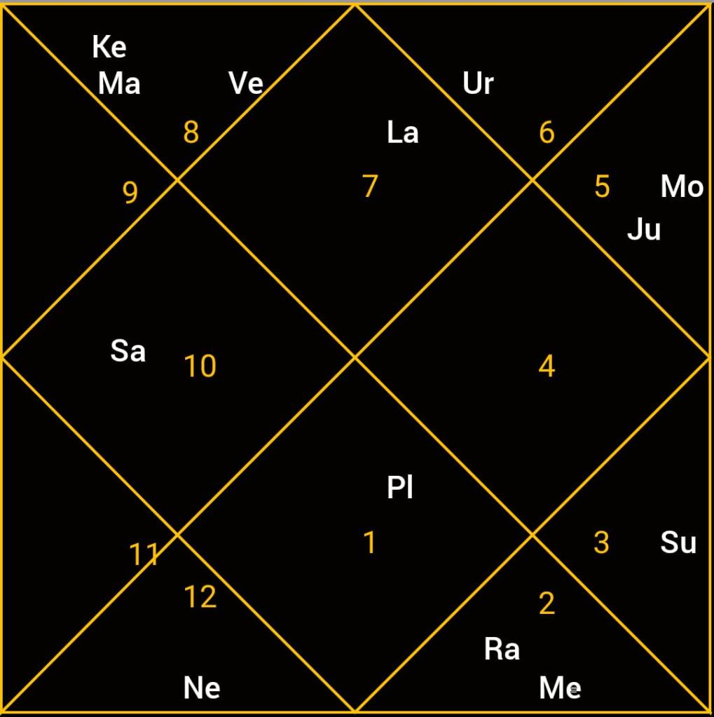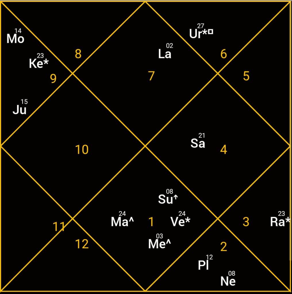 - Ruchaka Panch Mahapurusha yoga – When Mars is in it’s own sign or in it’s exalted sign Capricorn and in Kendra at the same time. In his chart, Mars is in Aries making this yoga. Responsible for authoritarianism, leadership qualities. Good for the military. In his case since the Mars is combusted, but at the same time surrounded by benefics and also because of the Rahu antardasha, he was imprisoned, but only for 9 months.